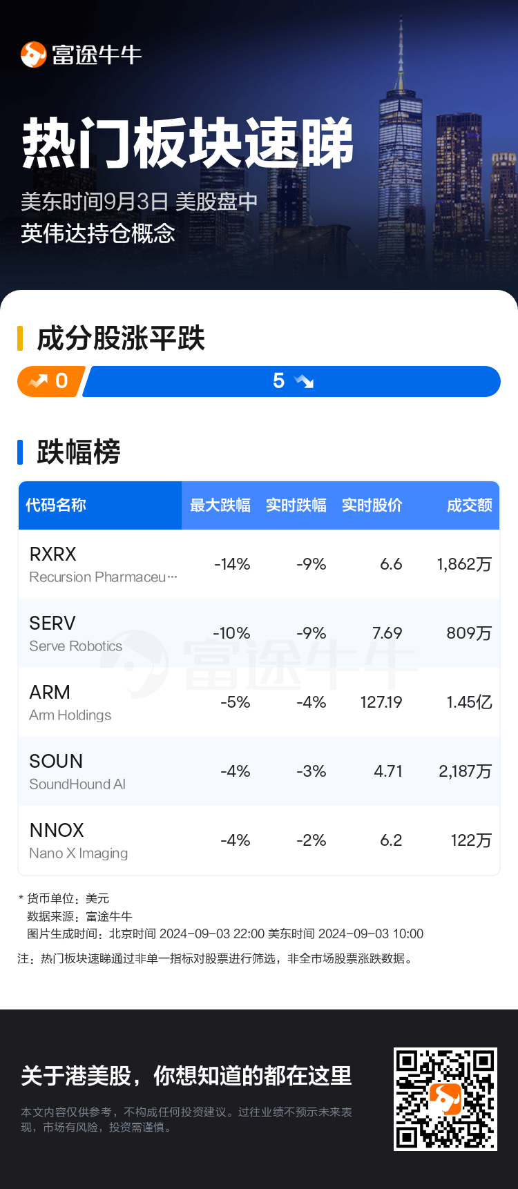 好意思东技艺9月3日报说念,本日好意思股盘中$英伟达握仓见解 (LIST20882.US)$走弱欧洲杯体育,甘休发稿,板块中5只成份股下落,Recursion Pharmaceuticals领跌板块。